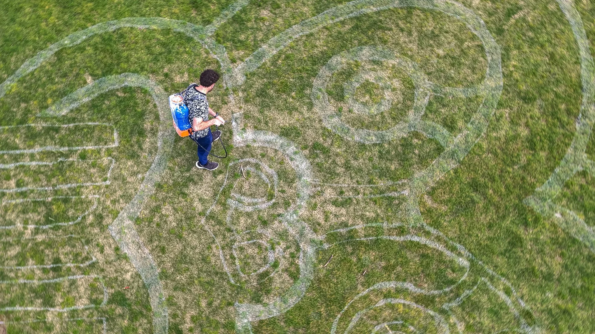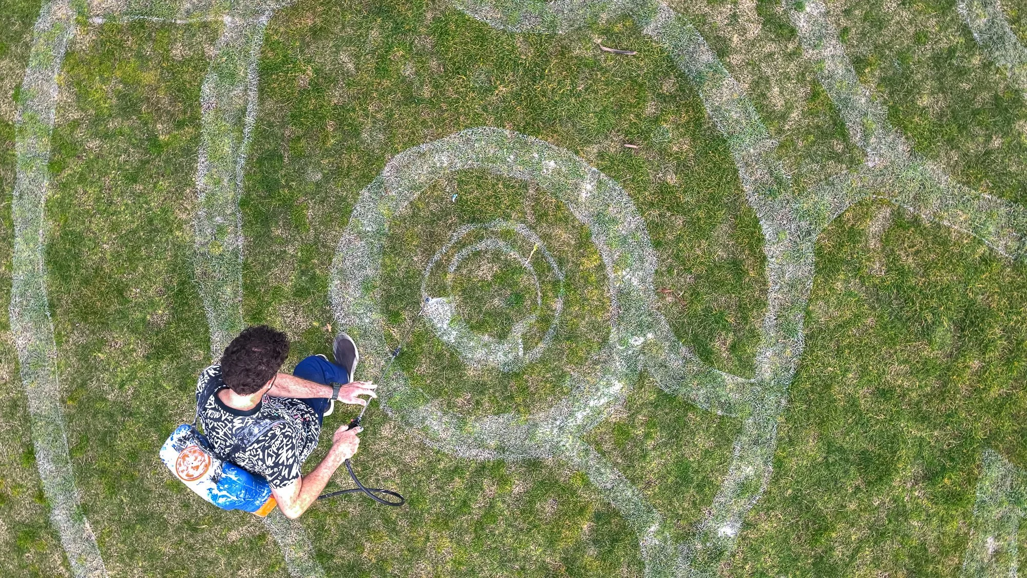 My latest land art commission was something truly special. To celebrate 50 years of Te Wiki o te Reo Māori, (Māori language week), I created a large-scale chalk artwork on grass for Papamoa Primary School. The design, reading Kia Kaha Te Reo Māori, was made using my new environmentally friendly chalk and water spray technique — months in development and now ready to release to the world.