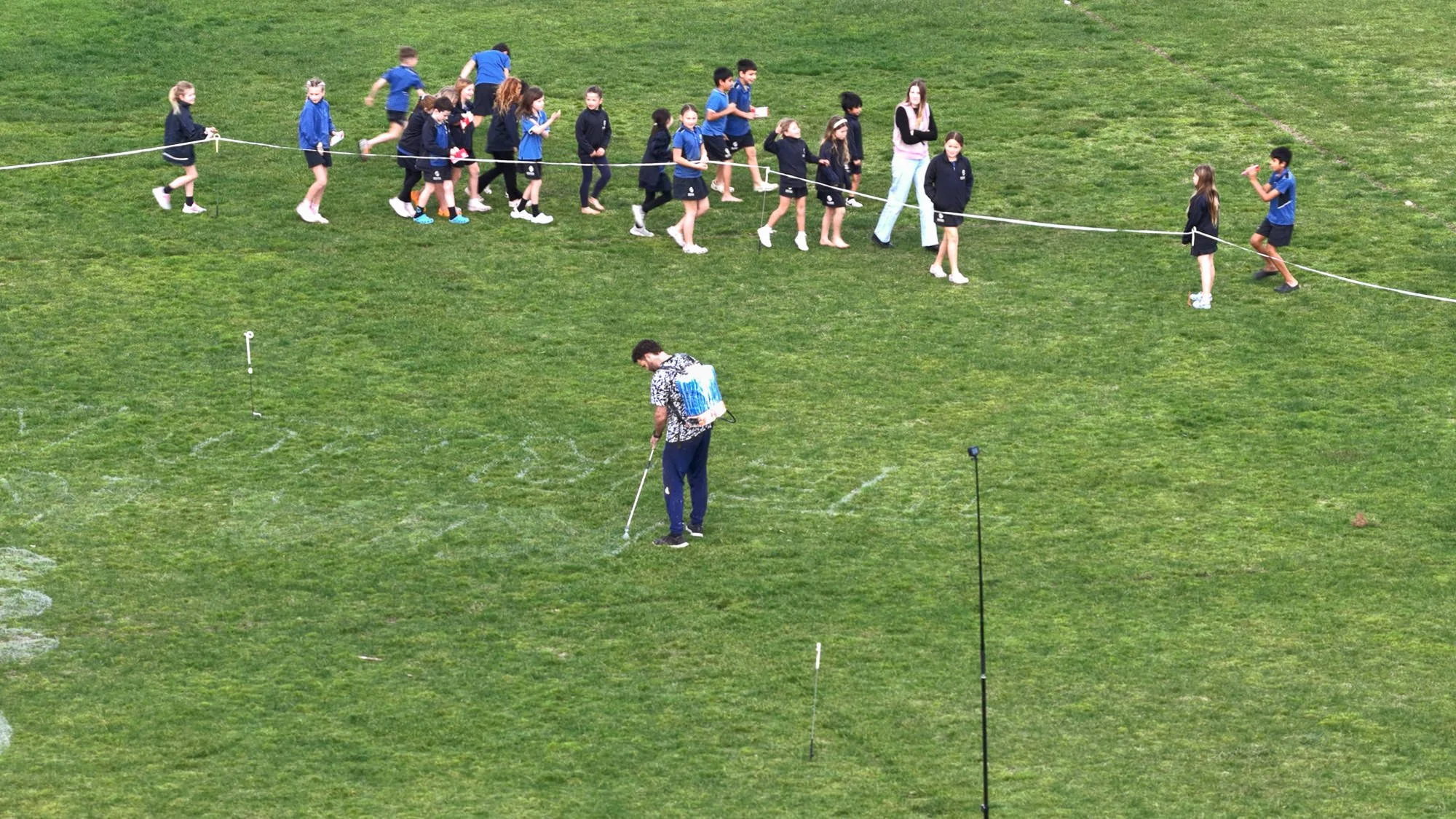 Seeing the entire school gather on the field and run across the artwork was magic. It brought the piece to life and reminded me why I love creating public, interactive art that connects people to place and culture. This project marked my first major chalk spray land art activation, expanding my work beyond sand art and into new sustainable surfaces.
